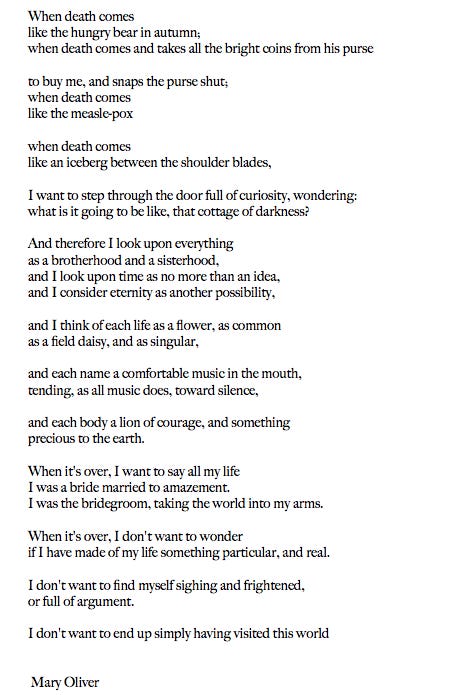 Another beautiful piece and I so resonate with it. I also spend my days studying, teaching, and immersing myself in the worst of the things people do to each other and the world, feeling dismay and disappointment and often fury and despair, yet still, regularly, I get shocked into delight, solace, wonder, and joy. Right now it's in the owl who's hooting nights and early mornings, the half moon still bright as the sky lightens, the lizards running skittishly across the patio, the incredibly heady sweet smell of the pittosporum that's dropping its blossoms into drifts, a kindness or gentleness or generosity. My kids used to mock me for how frequently on a drive I'd suddenly cry out: look at the pretty grass! look at the clouds! I see a vulture/hawk/blue jay/name-a-bird! Unlike Oliver, I don't anticipate a door opening into another world after this one, so it holds all of my emotions and they are as ephemeral as the rest of it.